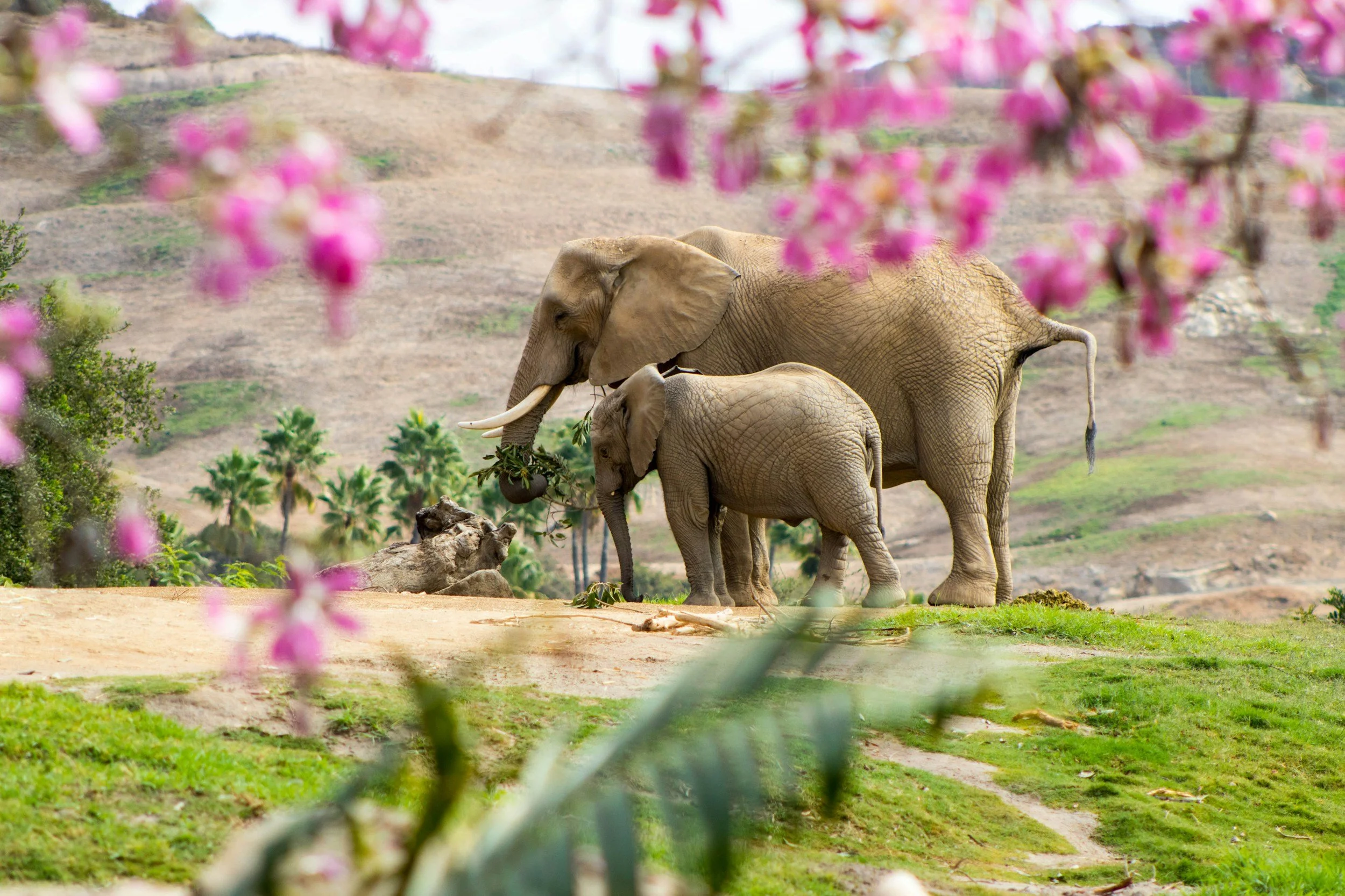 A mother and young elephant being observed through florals on a safari game drive